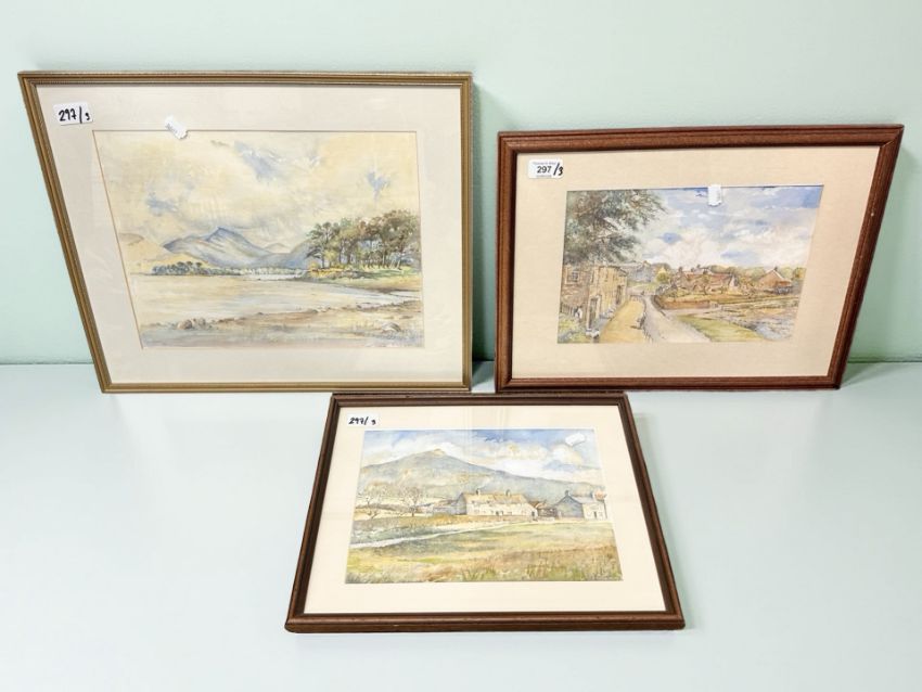 Ken Stainsby (British, 20th Century) : Figures in a Country Village, watercolour, signed, dated 1975, 20 cm x 29 cm, together with two further watercolour drawings by the same artist also depicting topographical subjects, both signed and dated, all three parts framed. (3)
