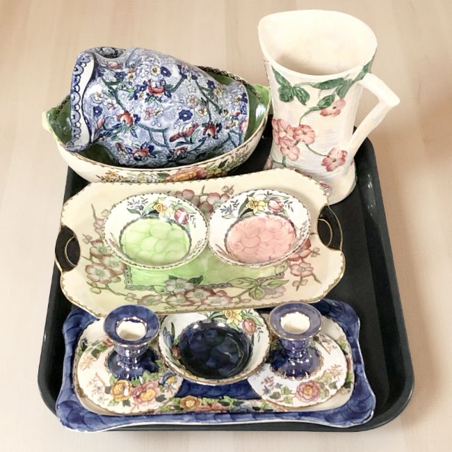Maling lustre items including dressing table tray with matching bowl and squat candlesticks, several other bowls, jug, etc.