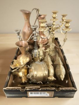 Brass and copper wares including candelabra, jugs, figures of pheasants, ornamental flintlock pistols, etc. (1 box)