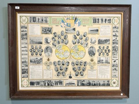 A lithographic print commemorating the Great World War 1914-1918, published by Educational Publishing Co. Ltd., London & Cardiff, depicting important allied and political rulers and chiefs, chief events of the war, the treaty of peace and further important historical moments, contained in an oak frame, 100 cm x 75 cm.