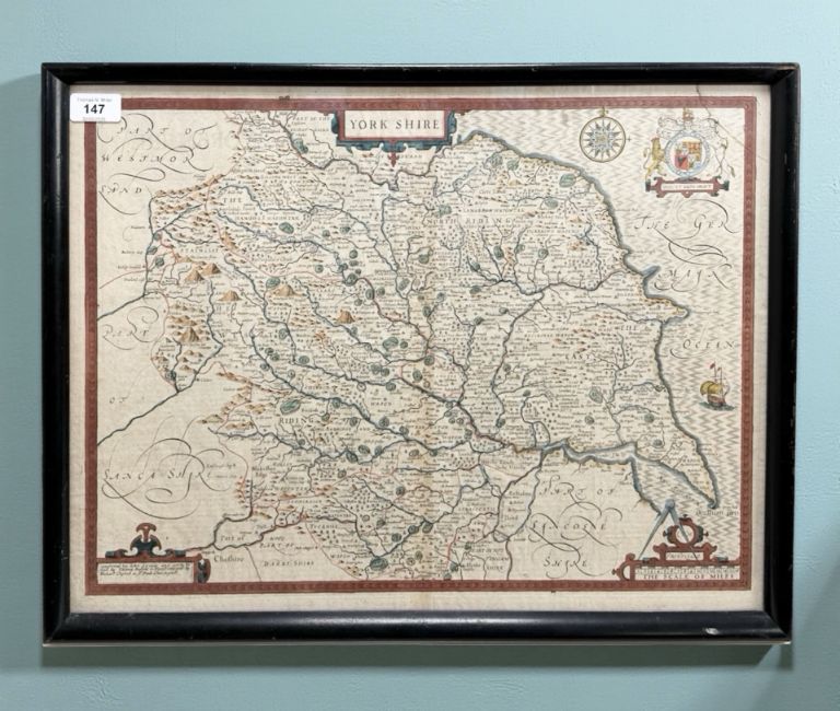 John Speede (1552-1629) : Yorkshire, a hand coloured engraved map, with scales, coat of arms and cartouche, with margins, 39 cm x 52 cm, framed.