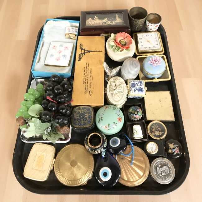 A group of dressing table items including compacts, cashmere papier mache trinket box and other boxes, oriental cork diorama, enameled items, travel timepiece, etc.