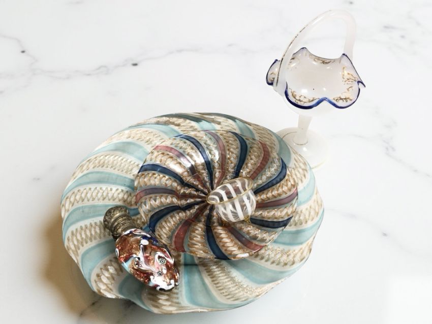 A group of art glass items to include two swirl pattern dishes, a scent bottle, a small footed bowl and a basket, height 11.5 cm.