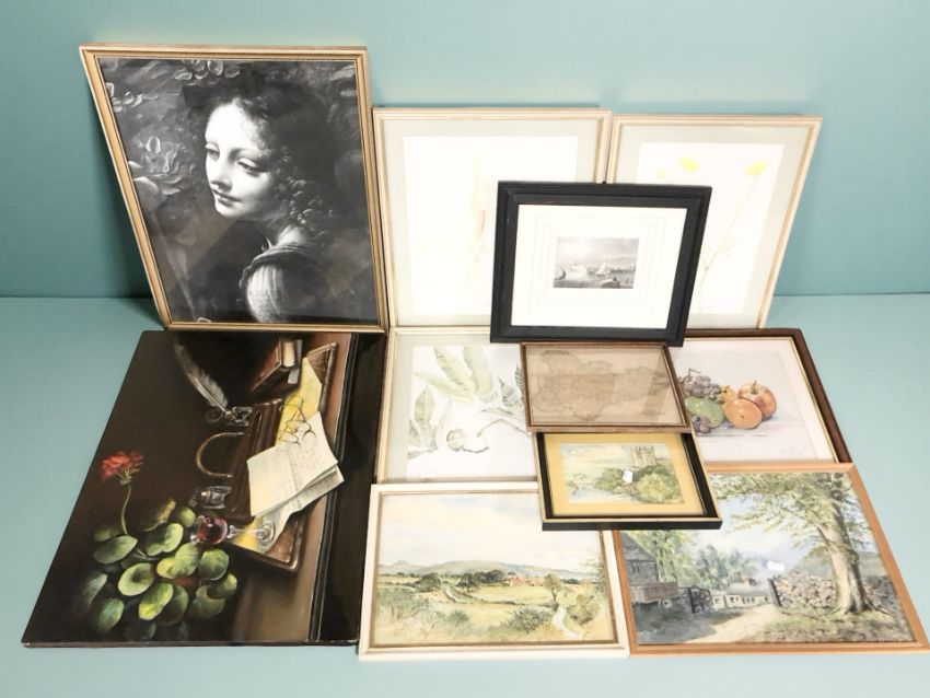 A group of pictures and prints, 19th century hand coloured engravings, watercolour landscapes, etc. (1 box)