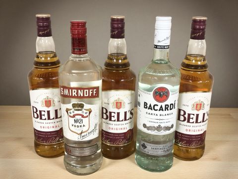 Three bottles of Bells blended scotch whisky, 40% vol, 1L, and two further 1L bottles of Smirnoff and Bacardi. (5)