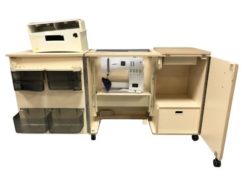 A sewing work station containing a Bernina Activa 140 digital sewing machine