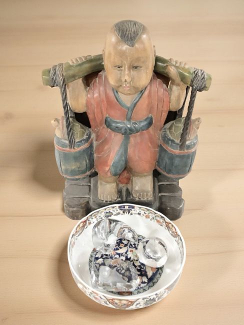 An oriental carved and painted figure of a boy carrying buckets containing tortoises, height 52 cm, together with a modern oriental porcelain fruit bowl and three glass paperweights.
