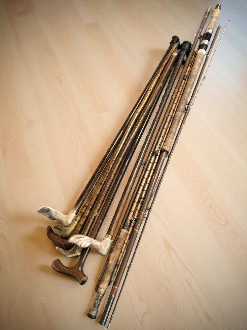 A group of vintage walking sticks, salmon fishing and cane rods (1 box)