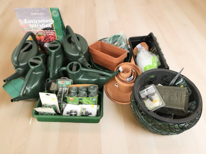 Assorted new gardening supplies, several watering cans, hanging baskets, bamboo, twine, hose fittings, etc (1 pallet)