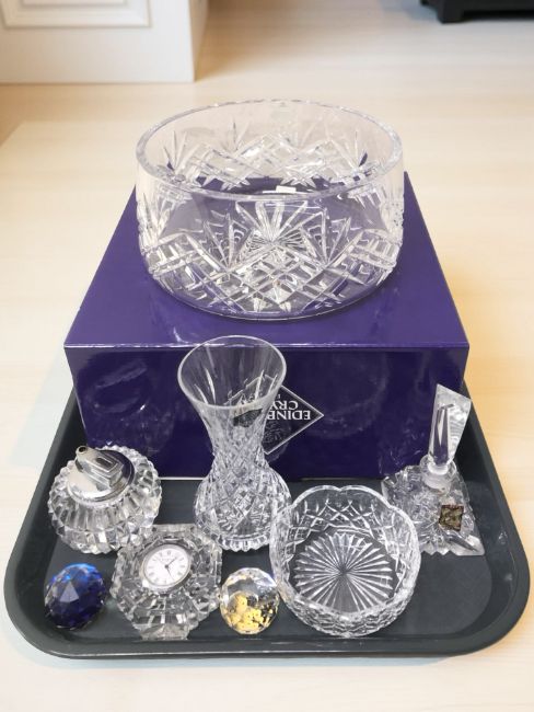 An Edinburgh Crystal fruit bowl in original box, diameter 20cm and other crystal including a Waterford Crystal time piece, table lighter, Bohemian scent bottle etc