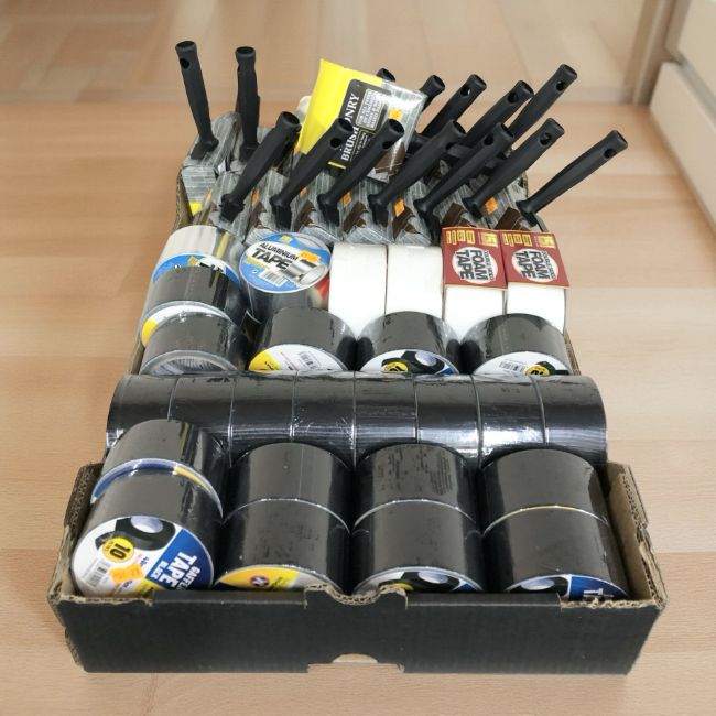 A box of new masonry brushes, gaffer tape, aluminum tape (one box)
