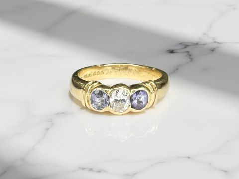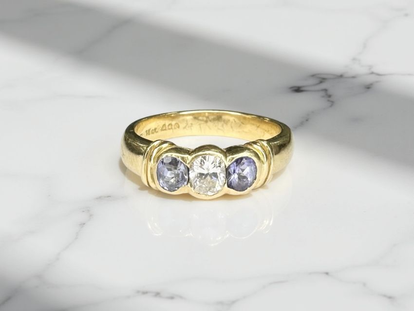 An 18ct yellow gold three stone tanzanite diamond ring, the central diamond approximately 0.25ct, size K