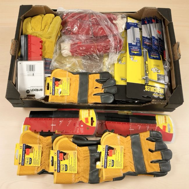 New work gloves, Amtech tile adhesive applicators, Hercules basin wrench, tile and glass drill bits (one box)