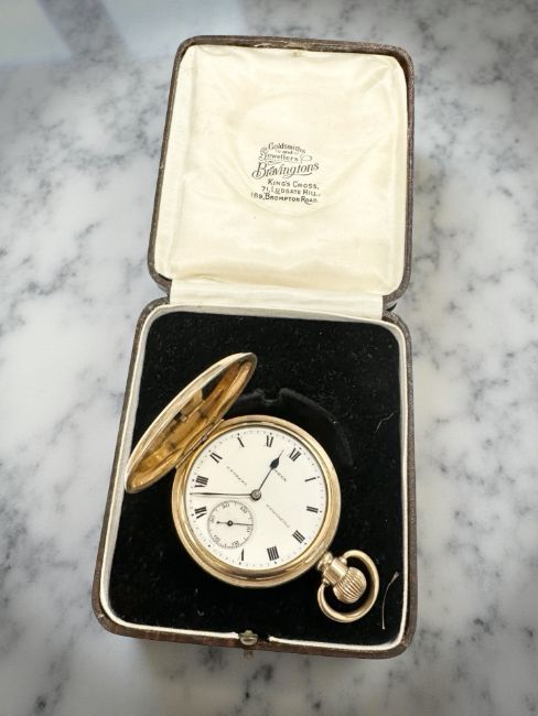 A gold plated full hunter pocket watch signed Suprex, J J Grant, Newcastle