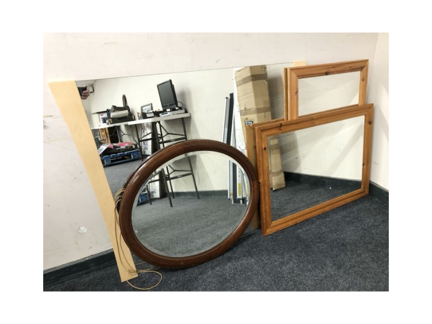 An Edwardian inlaid mahogany oval mirror, width 72 cm and three larger modern mirrors