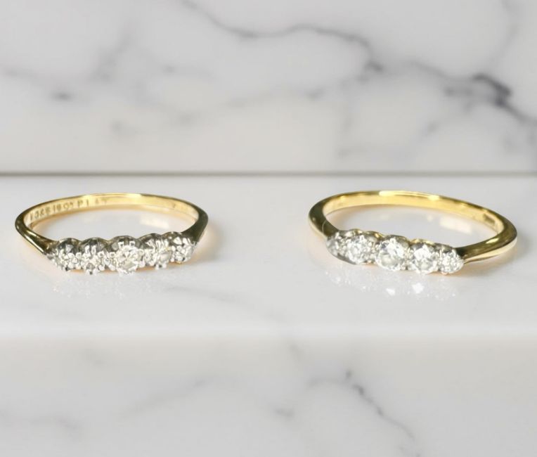 Two antique 18ct gold five stone diamond rings, sizes J and M. (2) CONDITION REPORT: 3.2g gross