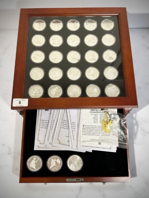 Danbury Mint : History of Britain Silver Bullion Collection - Twenty Seven Commemorative Fine Silver Coins, each 1 troy ounce, together with a U.S.A. 1 oz Fine Silver One Dollar Coin, with documentation, 28 coins in all, overall weight 882 g, in a fitted twin-tier display cabinet.