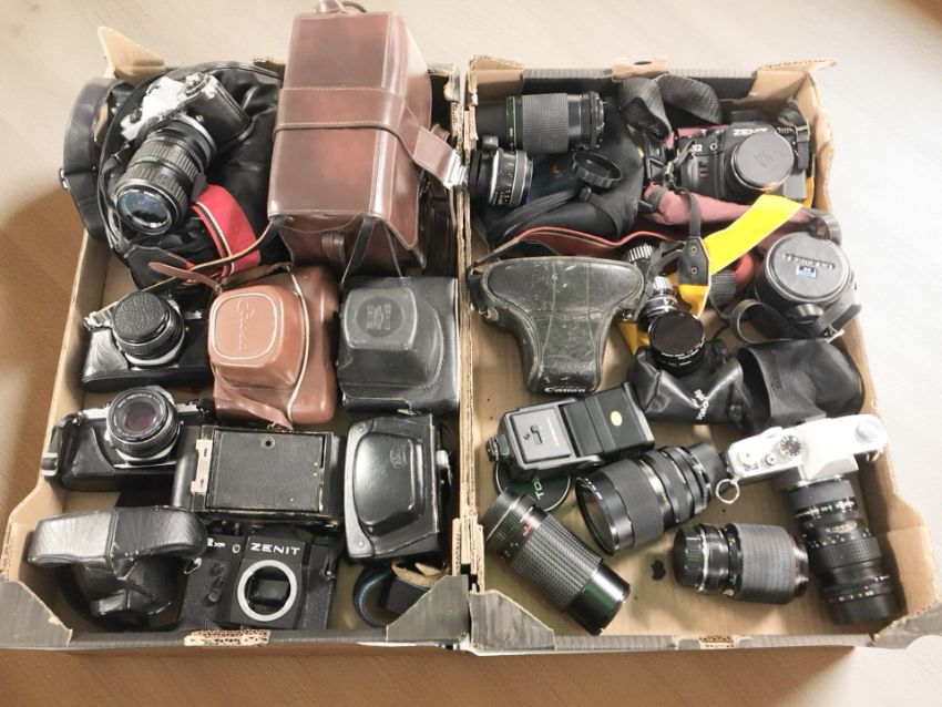 Vintage cameras including Zenit, Pentax, Mamiya, assorted lenses and accessories (2 boxes)