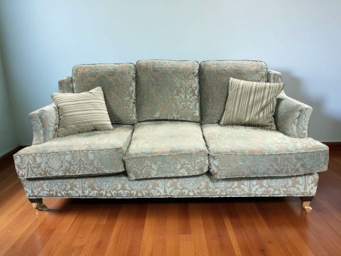 A good quality Victorian style three seater settee in two tone floral upholstery, raised on heavy brass castors, length 203 cm