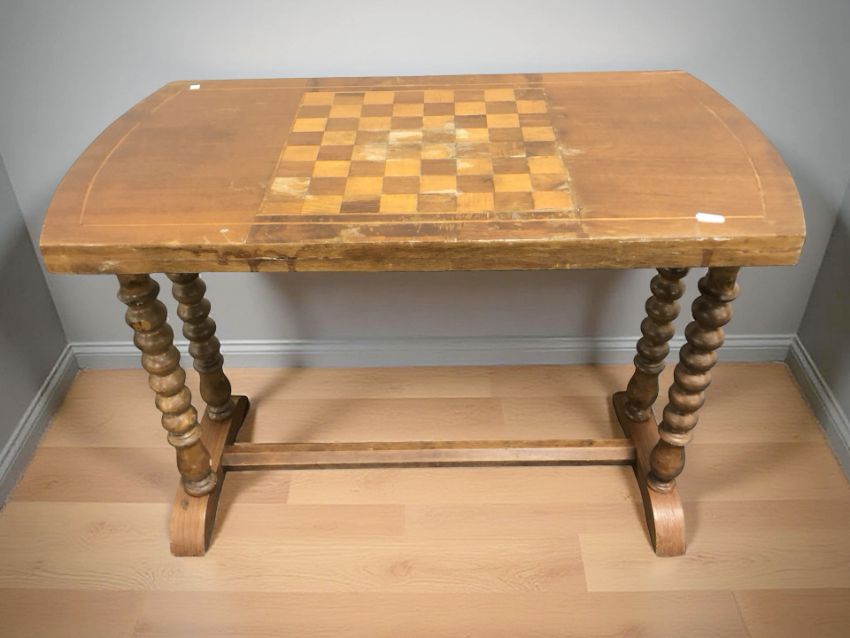 An inlaid walnut chess board occasional table, length 77 cm