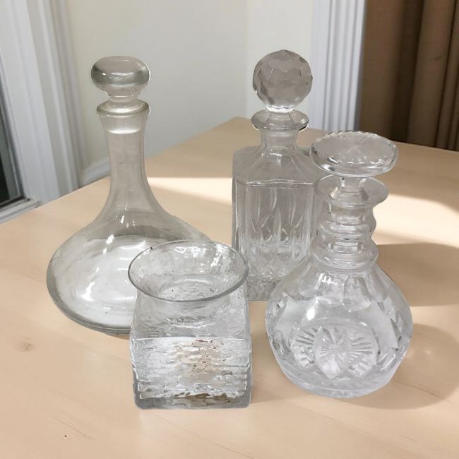 A ships decanter with etched grape vine decoration, two further decanters and clear glass vase