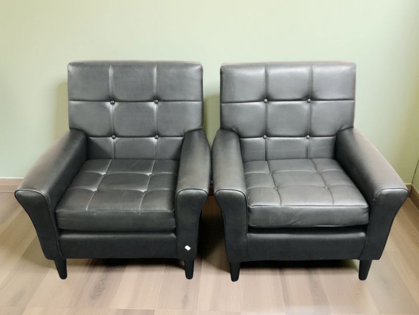 A pair of 20th century Scandinavian stitched and buttoned black vinyl armchairs, width 75 cm