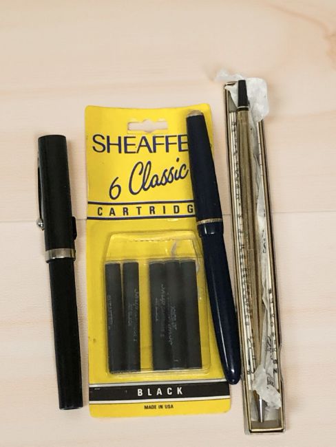 A Cross gold plated ball pen in box, Parker Junior Duofold fountain pen with 14ct gold nib, Sheaffer fountain pen and group of refills