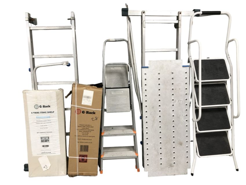 A group of ladders, decorator's platform and two G-rack five tier shelves in boxes