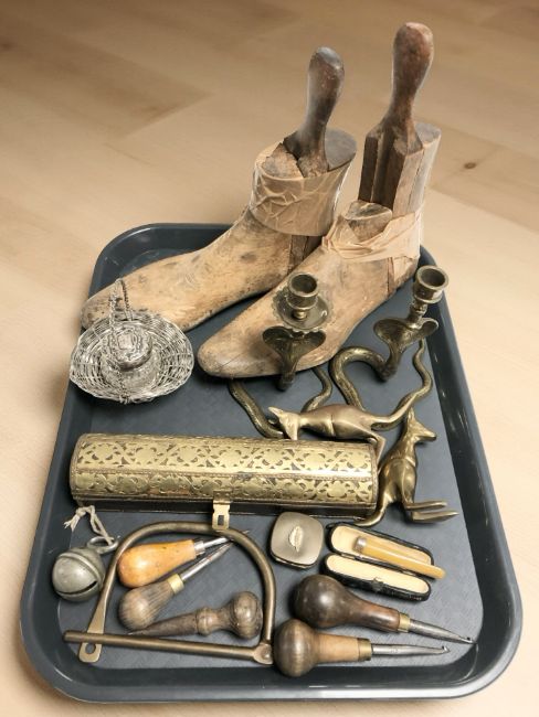 A pair of wooden shoe trees, pair of Indian brass candlesticks in the form of cobras, other brass wares, silver mounted cheroot and crystal jar etc