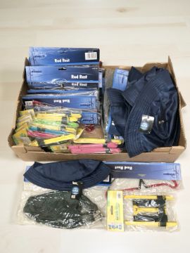 New fishing items including rod rests, crab lines, waterproof hats (1 box)