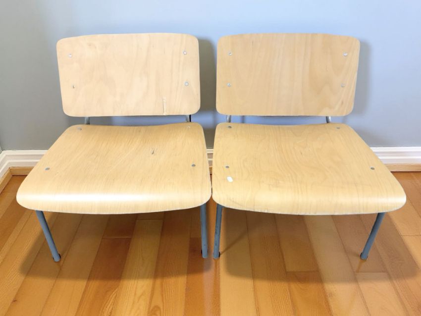 A pair of Ikea laminated wood low chairs on metal legs designed by Jonas Karlsson