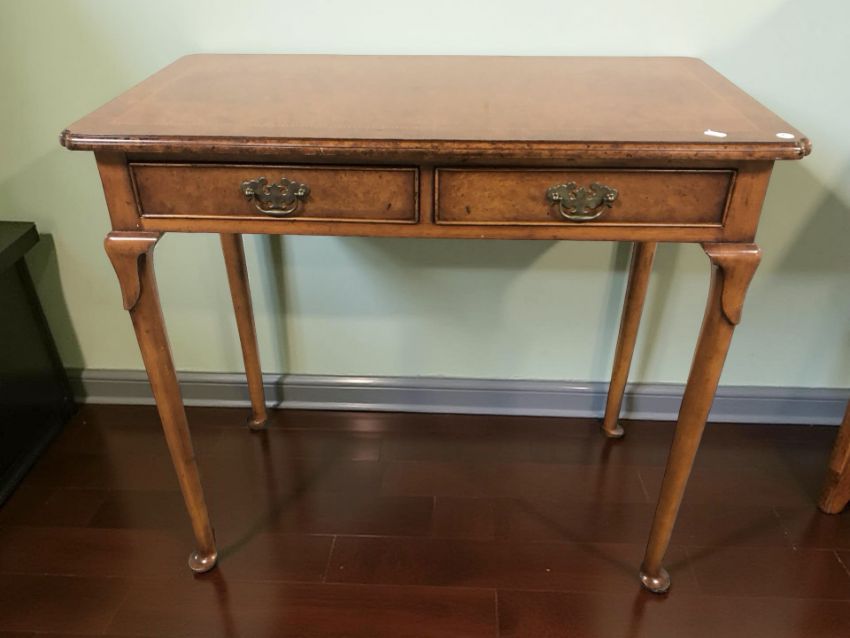 A reproduction yew wood and satin wood banded two drawer side table, in George III style, raised on pad feet. 92 cm x 49 cm x 83 cm