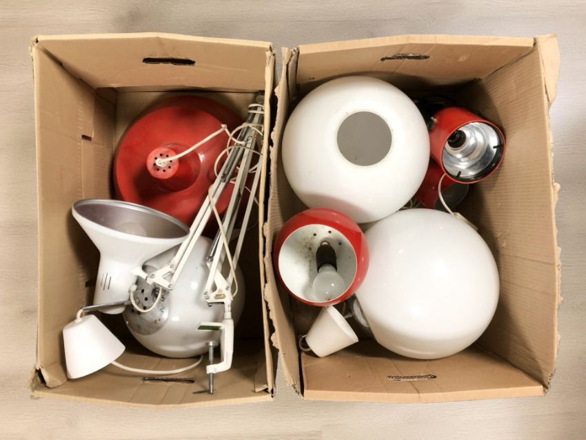 A group of Scandinavian pendant light shades, angle poised lamp, etc. (continental plugs, 2 boxes)