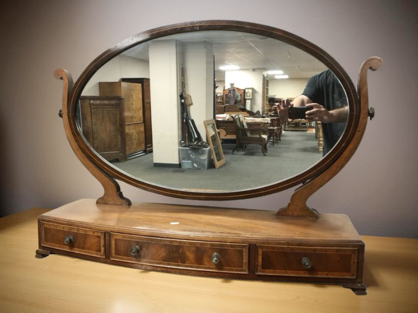 A large late Victorian mahogany and satin wood banded bow-front dressing table mirror fitted with three drawers, width 103 cm