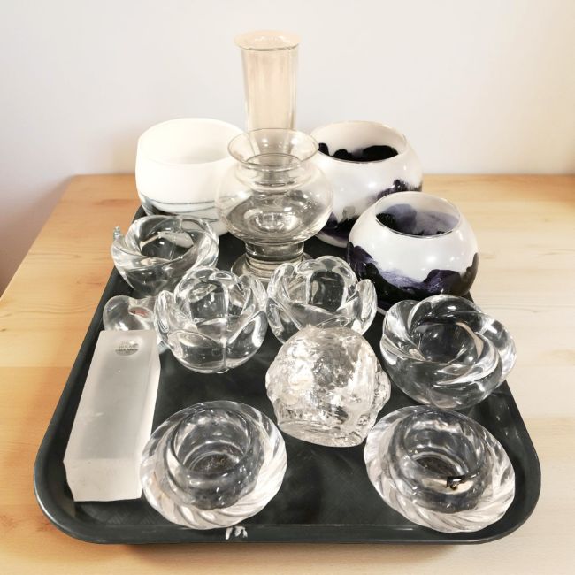 Scandinavian glass wares including several tea light holders, a Holmegaard candlestick, etc.