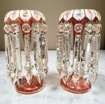 A pair of Victorian ruby glass gilt and transfer printed table lustres, each with twelve tapering crystal droplets, height 32 cm.