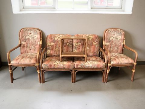 A four piece bentwood conservatory suite comprising a two seater settee, pair of armchairs and a glass topped table.
