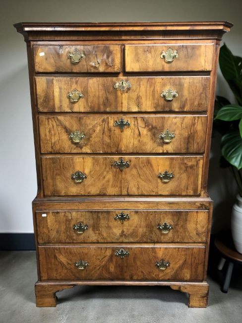 A George II provincial burr walnut and pine seven drawer chest on chest, mid 18th century, with brass bow handles and escutcheons, raised on bracket feet, 113 cm x 55 cm x 163 cm