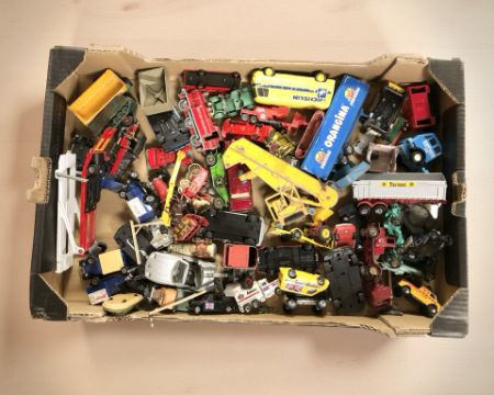 Assorted play worn die cast vehicles includng Lesney, Corgi, etc. (1 box)