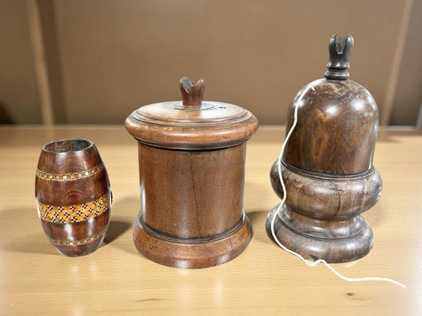An 18th century turned Lignum Vitae string box with steel blade cutter in finial, height 21 cm, a further turned walnut string box and a beech and parquetry barrel shaped beaker.