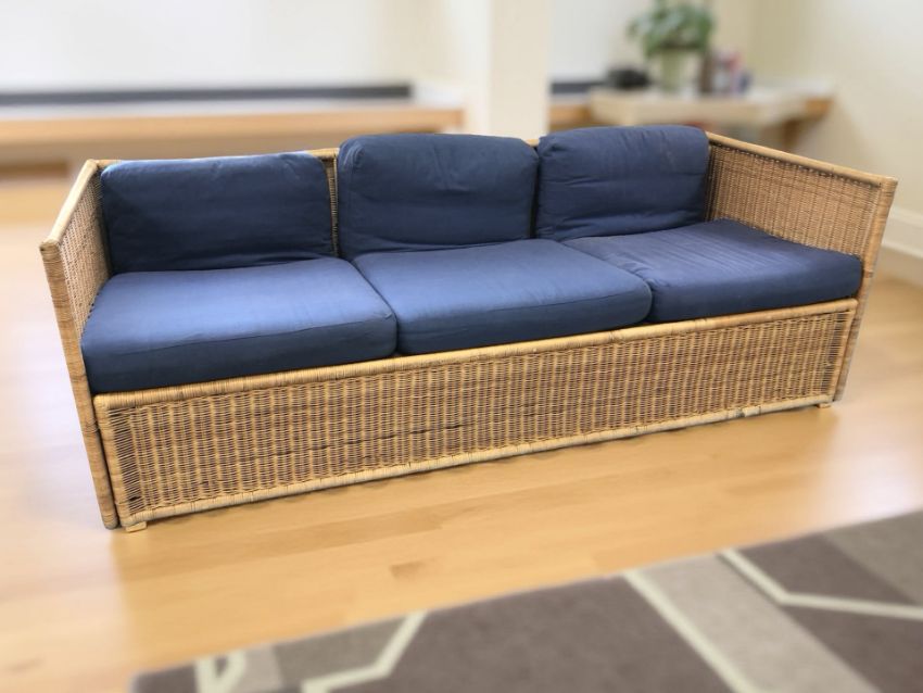 A Scandinavian wicker three seater day bed, 205 cm x 83 cm x 67 cm.