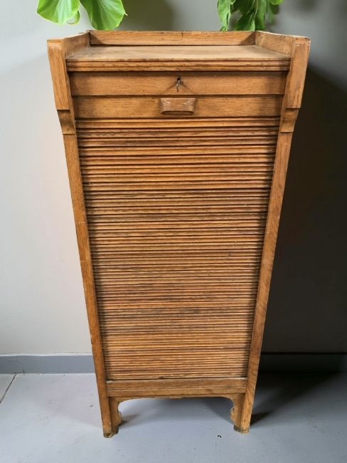 A 1920's oak tambour front office pedestal filing cabinet, fitted ten drawers internally, with working key, 54 cm x 43 cm x 133 cm