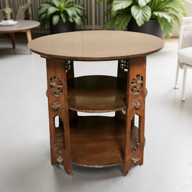 An Arts and Crafts three tier stained wooden occasional table, width 64 cm.