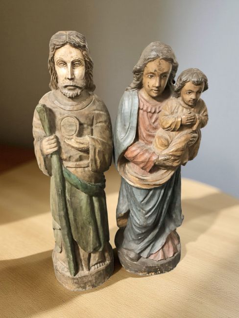 A pair of carved and painted wooden figures depicting Jesus, Mary and Joseph, tallest 95 cm.