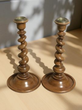 A pair of Victorian turned walnut barley twist candlesticks, height 27 cm.