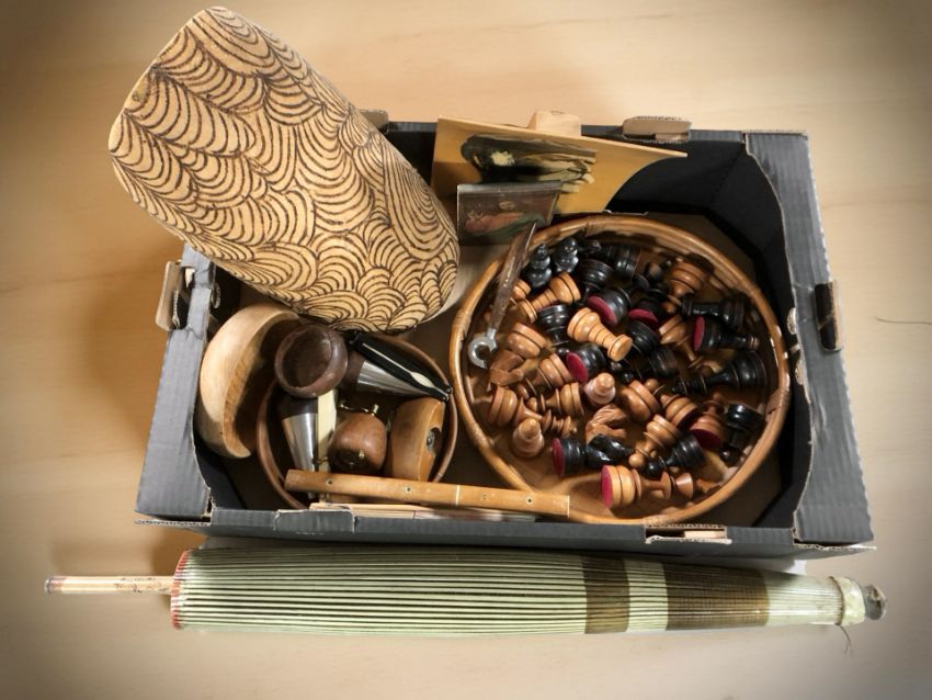 A set of turned wooden chess pieces, other treen items, an oriental parasol, religious icon. (1 box)