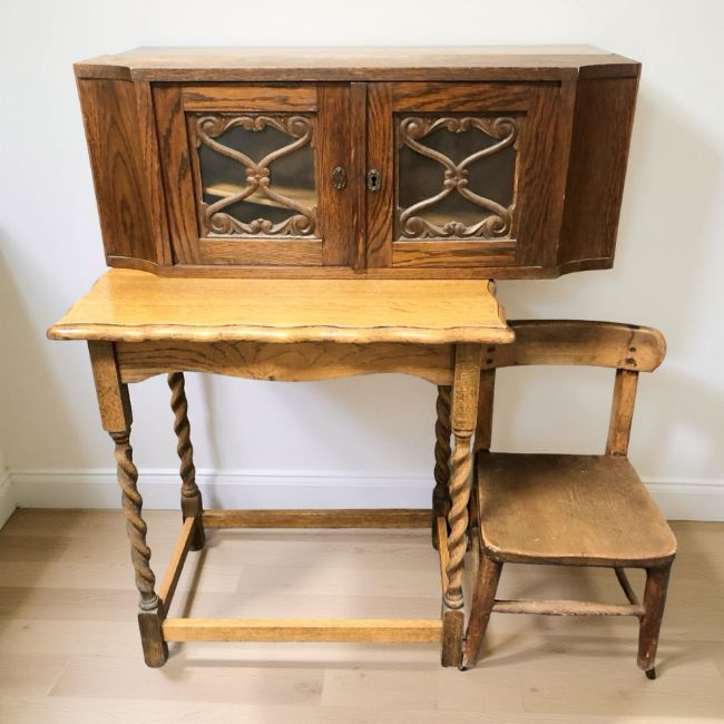 An oak double door wall shelf, child's chair and a scalloped edge occasional table