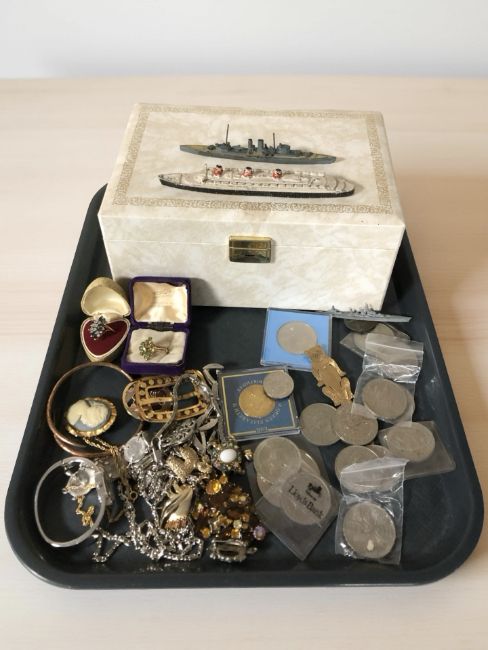 A collection of crowns, costume jewellery, a modern jewellery box, two small die cast model ships, etc.
