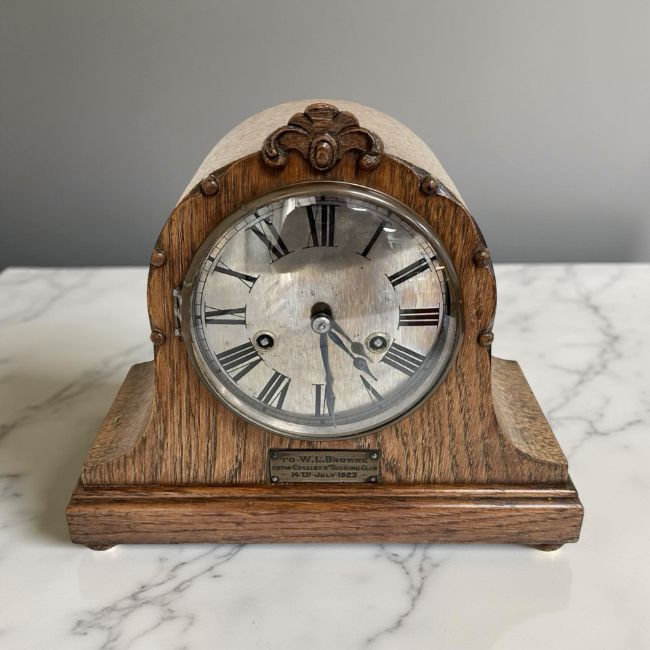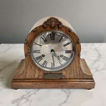 A 1920's oak eight day mantel clock, movement by HAC Wurttemberg, with pendulum and key, height 25cm.