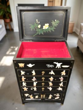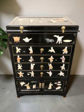 A reproduction Japanese black lacquered and hard stone inlaid chest, 63 cm x 42 cm x 93 cm